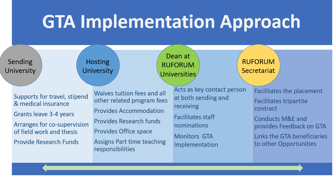 The Graduate Teaching Assistantship (GTA) Programme contributes to one of RUFORUM's three strategic goals to build synergy from networks of specialisation to develop quality human resources and capacity required to intensify and increase Africa's agricultural productivity and competitiveness and its Vision 2030 Strategy that focuses on building postgraduate training and research capacity in its member universities. The GTA programme has been implemented since 2015 to: (i) improve the quality of higher education and increase the pool of PhD-level trained academic staff in African universities; (ii) provide opportunities for the doctoral research to contribute more directly to African development; (iii) strengthen inter- university collaboration in the field of higher education in Africa; and (iv) promote staff mobility among RUFORUM member universities, and across Africa. Initially, the programme focused only on agriculture and related fields; recently it has been opened up to more fields based on the gap areas and priorities of member universities.